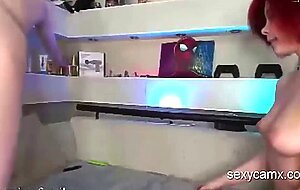 Two horny teen sluts redhead and brunette share load of cum after blowjob and hard pounding in hardcore amateur threesome on webcam show live at sexycamx.com