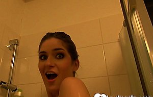 Amazing babe with nice tits moans in pleasure while fingering herself in the shower.