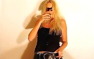 Blonde in jeans pees in wine glass